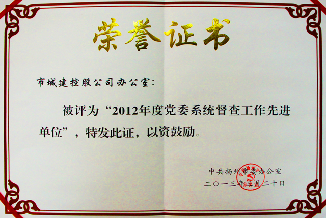 5月20日上午,在全市黨委系統督查重大項目推進會議上,集團辦公室榮獲了2012年度全市黨委系統督查工作先進單位稱號。