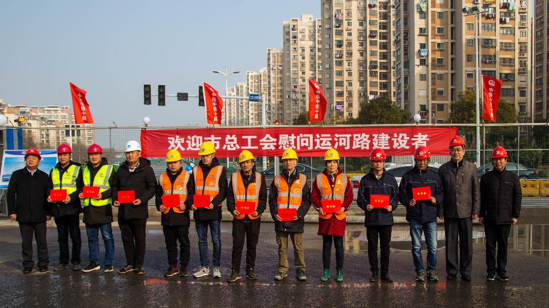在新春佳節即將到來之際,1月19日上午,市總工會副主席戚安寶帶隊來到運河路快速化改造工程項目部,親切慰問了一線施工人員,并為他們送上了新春的祝福。城控集團副總經理季紅軍、工會主席張正斌參加了慰問。