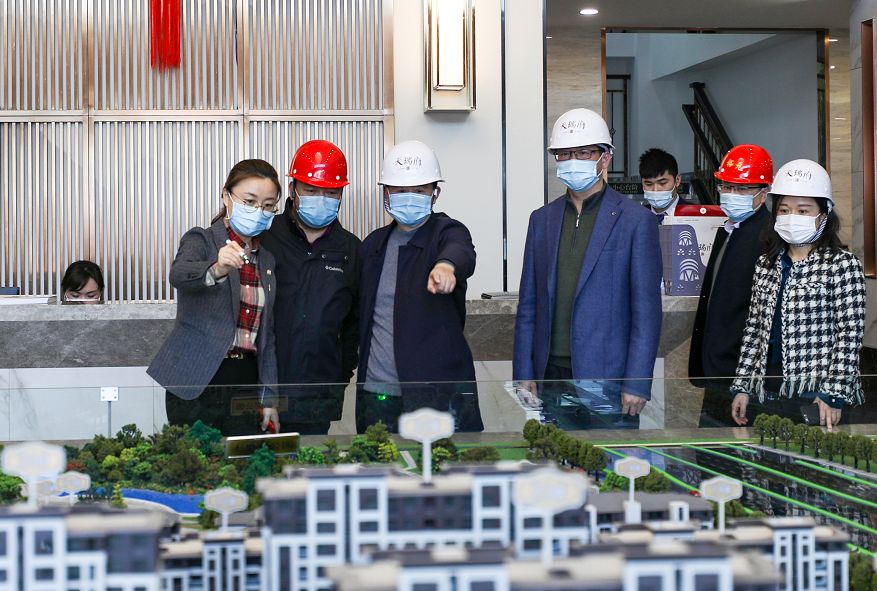 葉善祥一行先后實地查看了天瑞府、揚州頤和醫療健康中心、九境融園項目建設情況,詳細了解了置業公司關于疫情防控工作、復工復產、施工進度情況。隨后召開會議,進一步研究項目進度安排、存在的問題及工作舉措。