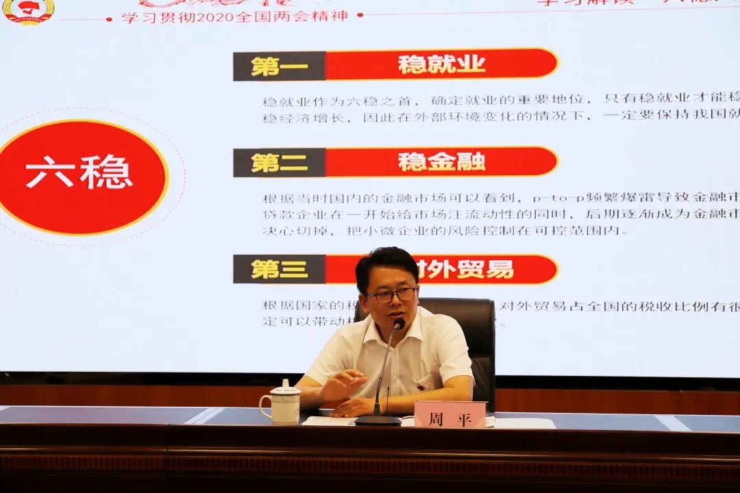 黨課從全國兩會為出發點,圍繞“六穩”“六?!眮碇v述政府的工作重心和工作重點的轉變,指出面對嚴峻挑戰時,要堅持穩中求進工作總基調,堅持新發展理念。