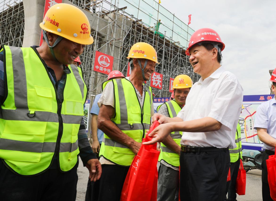 8月6日上午,市人大常委會副主任、市總工會主席楊正福一行來到運河南北路快速化改造工程施工現場,看望慰問奮戰在重點工程施工一線的建設者們,拉開了揚州市總工會以“清涼一夏‘送安康’、聚力奪取‘雙勝利’”為主題的夏季安康“三送”(送清涼、送安全、送法律)活動序幕。城控集團黨委書記、董事長葉善祥,市總工會副主席韓士軍,城控集團副總經理季紅軍參加活動。