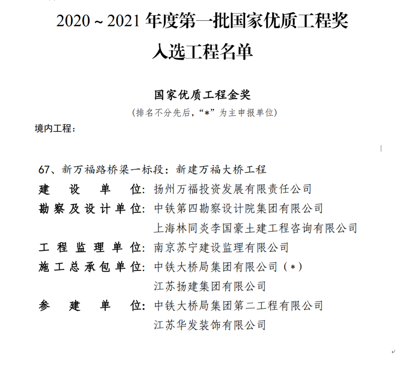 近日,“2020-2021年度第一批國家優質工程獎評選結果”揭曉,由城控集團萬福公司承建的新建萬福大橋工程榮獲“國家優質工程獎”殊榮。這是該工程繼“中國建筑工程裝飾獎(建筑幕墻類)”后,獲得的又一項國家級大獎。