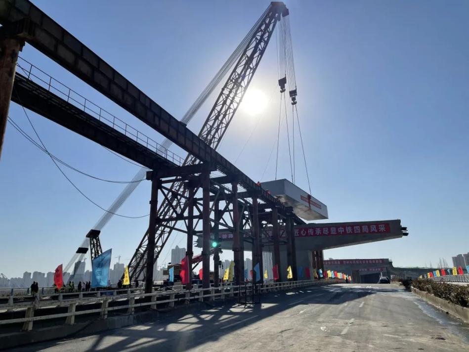 跨古運河鋼箱梁橋施工是項目的重難點。為了確保此次吊裝順利完成,項目部成功解決了35KV高壓遷改、老橋下部結構施工空間受限、橋位西側揚州閘導流墩對吊裝設備站影響、老橋上不能搭設臨時支架、鋼梁兩側混凝土箱梁同時施工等多重困難,對現場施工人員進行安全技術交底,及時清除承臺冰雪,做好冬季防護措施。