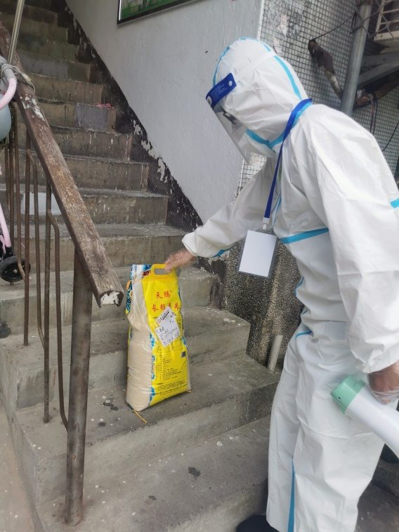 替居民運送物資也是志愿者們每日的重要工作,那么多居民居家隔離,不準外出,菜哪里來?米哪里來?志愿者們承擔了居民樓棟間的送貨員?!?1棟205,早飯給你放在樓梯口臺子上了,請下來拿一下!”“喂,你好是23棟403的劉**???你家的大米到了,放在樓梯口了,請自取一下!”
