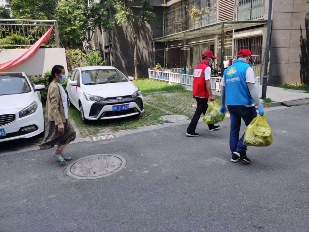 由于疫情的管控,許多路口設卡,導致居民在手機APP上采購的蔬菜及生活必須品進不來。志愿者們第一時間從內聯系在外輪休的志愿者去卡口,在全方面消毒的情況下幫居民領取生活必需品?!耙咔橄拢銈円惨欢ㄒWo好自己啊?!本用癜l自肺腑的關心也讓志愿隊成員們心頭涌上一陣暖意。