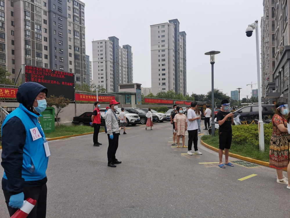 “請大家排好隊,保持一米以上安全距離,不要造成人員聚集,請提前準備好你的身份證……”志愿者不斷提醒居民注意。在翠月花園核酸采集點,志愿者們穿梭在排隊人群中,邊安撫居民緊張情緒,邊引導居民即測即走?!半m然天氣很悶熱,工作量很大,但是我們有信心能保質保量完成全小區核酸檢測任務?!彼麄儾活櫤韲邓粏?,依舊熱情且耐心地回答居民的問題,引導現場秩序。11日下午,雨淅淅瀝瀝下個不停。雖然避雨棚近在咫尺,但志愿者們面對風雨寸步不離崗位,他們笑著說道“這點風雨算啥呀?”一周來,志愿者們協助社區開展了4次核酸檢測,共檢測居民約12000人次。