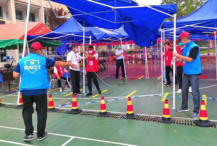 9月2日清晨,天空陰云密布。早6時許,第三組26名志愿者全部到達檢測地點——朱自清小學,大家按照分工職責,各就各位,忙著核酸檢測前的準備工作。“今天有雨,請志愿者抓緊時間再檢查一下帳篷和支架……”季紅軍提醒道。6:30,檢測順利開始;7:35,小雨不期而至;7:45,大雨傾盆而下,很快,雨水順著風向在帳篷凹陷處形成積水,積水越來越多,幾名志愿者拿出早已準備好的木棍,找好角度,用木棍將積水推出,并不時提醒居民注意安全。光伏公司志愿者蘇峰強忍腰疾,和大家一起全然不顧全身濕透,如此反復直至8:30雨水漸止,確保了核酸檢測順利進行。