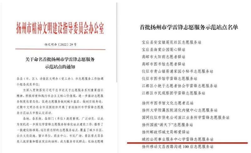 近日,從揚州市文明辦傳來喜報,城控公用事業服務中心(長江水務服務廳)被命名為2022年首批揚州市學雷鋒志愿服務示范站點。