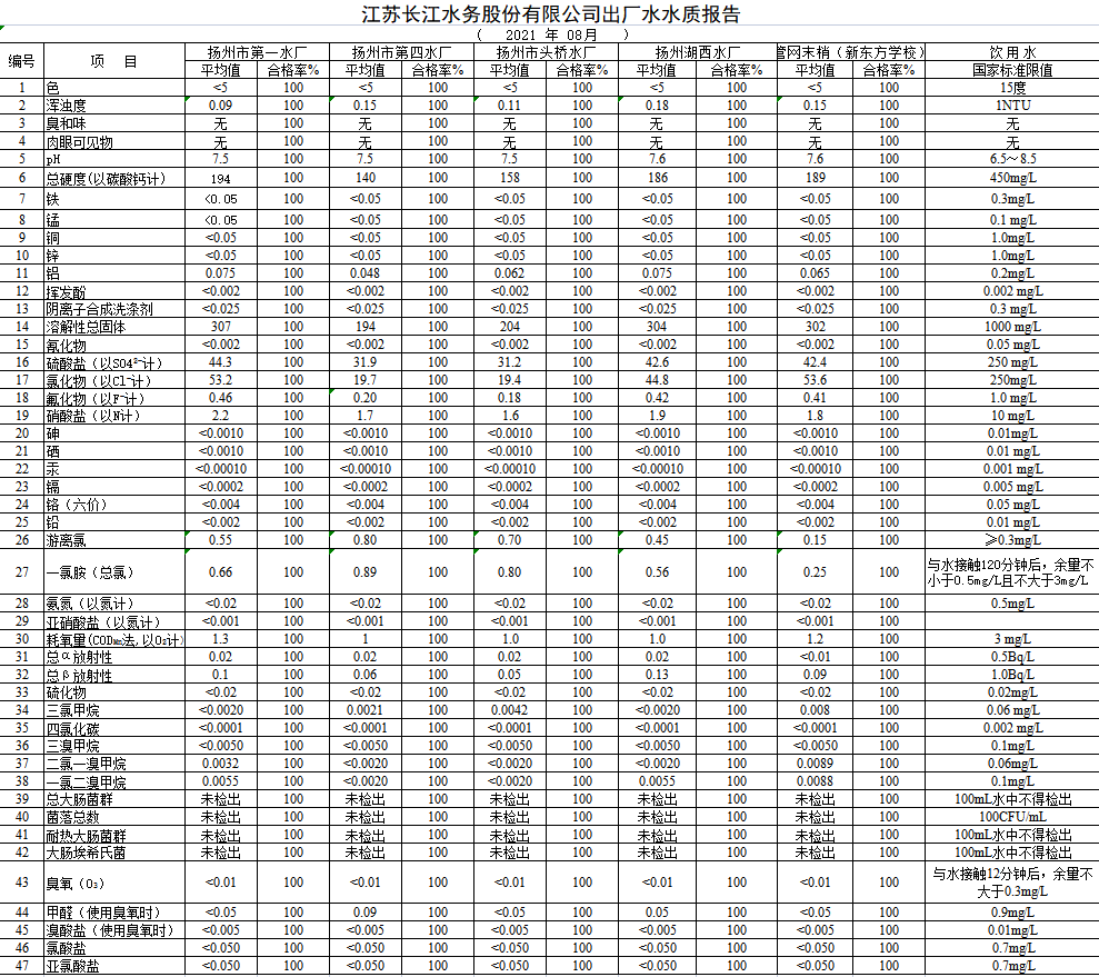 江蘇長江水務股份有限公司出廠水水質報告 ( 2021年08月)