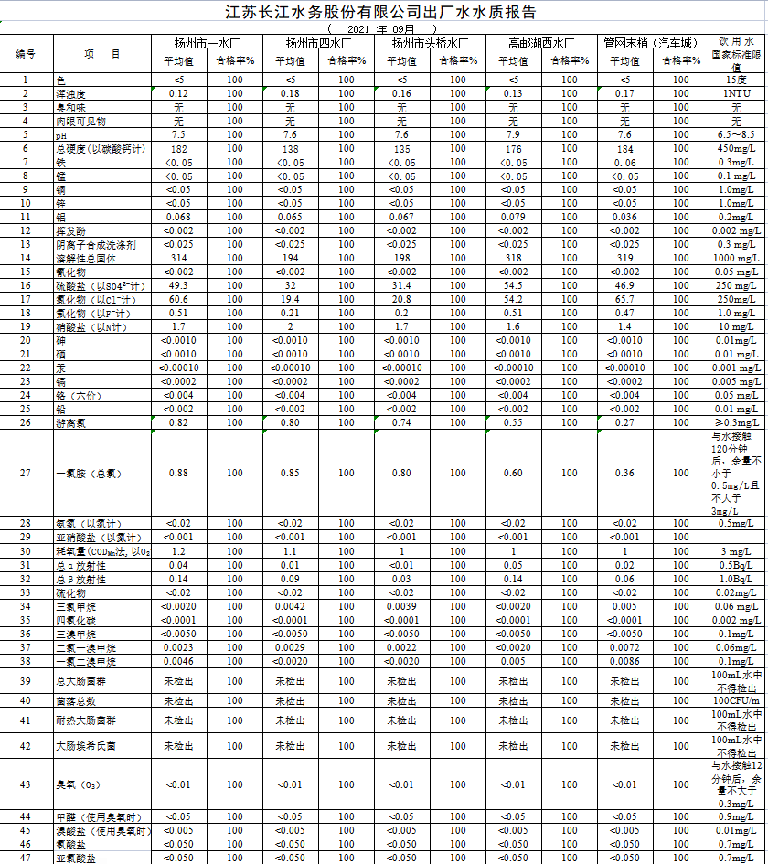 江蘇長江水務股份有限公司出廠水水質報告 ( 2021 年 09月 )