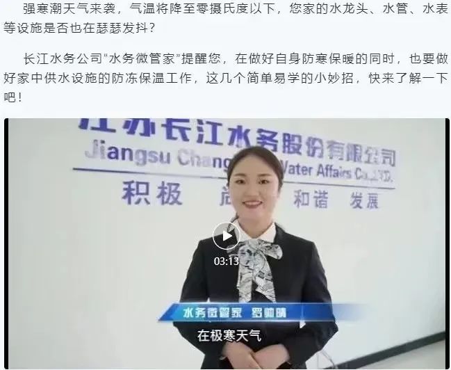 “水務微管家”開通企業微信平臺,攝制多條微視頻,推送供水服務咨詢,普及自來水知識,與重點用水企業實現“一對一”線上線下聯動服務。在寒潮降溫前,通過企業微信平臺、社區網格、志愿者服務微信群密集發布冬季自來水防凍提醒,上門為老年用戶和弱勢群體做好冬季用水設施的防凍保溫措施。