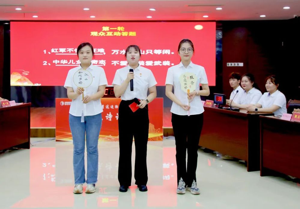 風險題“飛花令”環節將競賽推向高潮?!耙粯蝻w架南北,天塹變通途”“赤橙黃綠青藍紫,誰持彩練當空舞?”“裝點此關山,今朝更好看”……各支代表隊你來我往,輪番背誦含有“數字”、“顏色”、“山”的毛澤東詩詞,選手們進行了一場文化素養與詩詞積累的較量,精彩的接龍不時贏得觀眾的陣陣喝彩。經過近兩個小時的激烈角逐,最終第一黨支部代表隊榮獲一等獎、第三黨支部代表隊獲得二等獎、第二黨支部代表隊獲得三等獎。