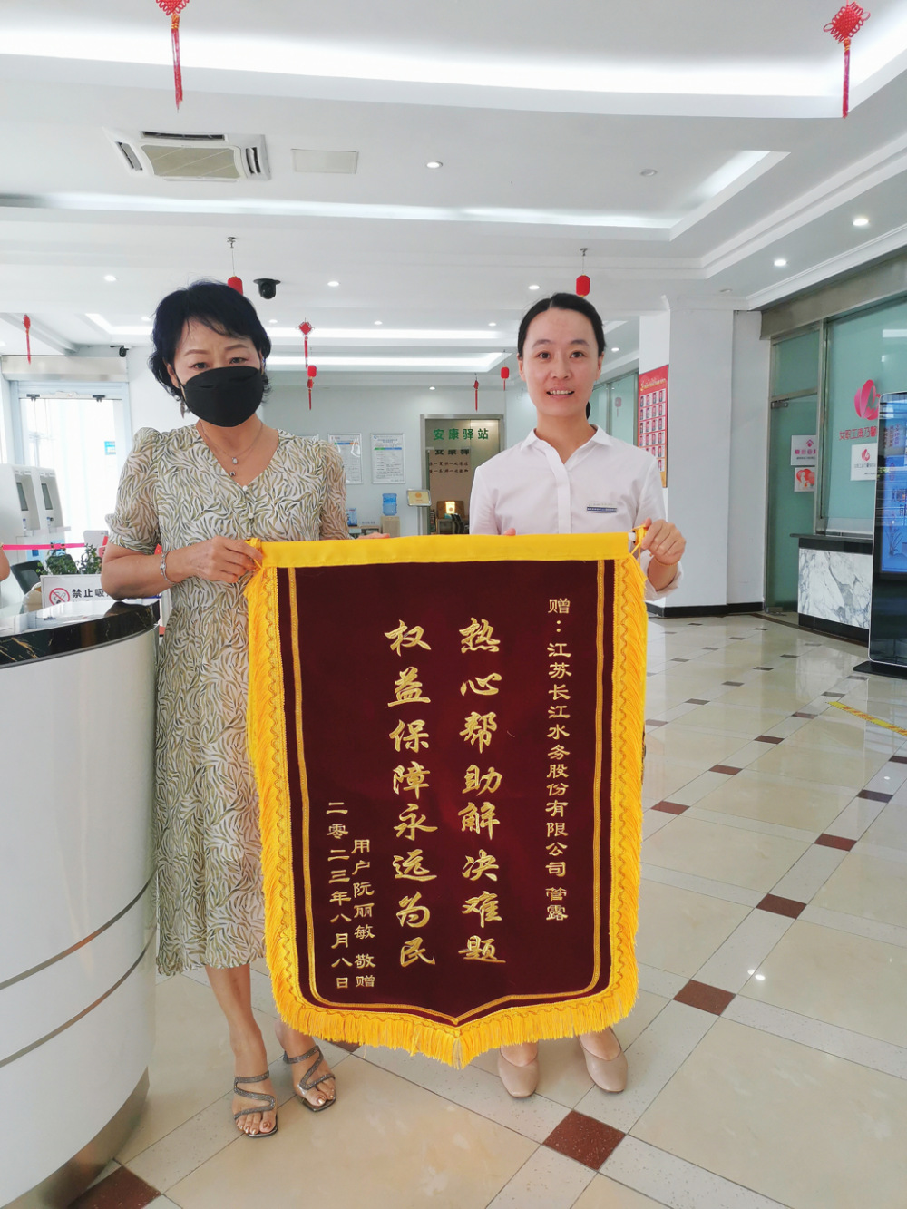 8月15日下午,市民阮女士專程來到長江水務營業大廳,送來一面印有“熱心幫助解決難題 權益保障永遠為民”的錦旗,感謝“水務微管家”管露服務熱情、辦事高效,為其解決難題。