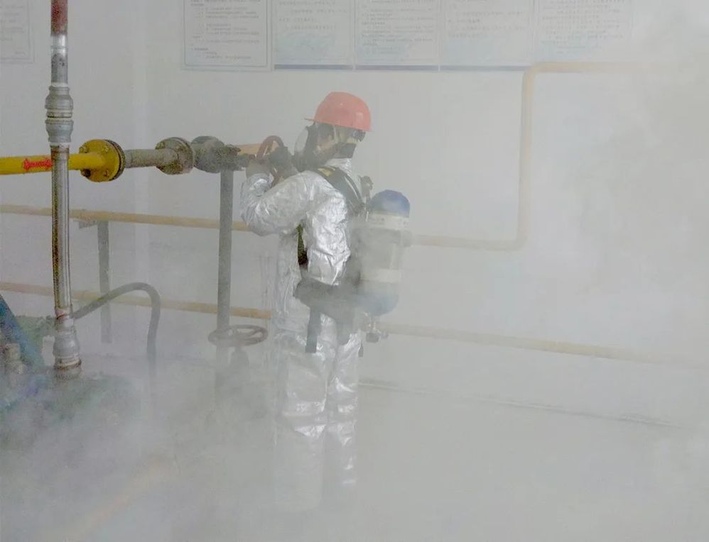 演練分兩個階段進行。第一階段模擬液化氣槽罐車在卸車作業時,裝卸鶴管脫落,突發大量液化氣泄漏。在場作業人員根據預案,第一時間關閉壓縮機,切斷電源,迅速拉斷位于車尾部的緊急切斷閥,阻止槽車罐體內液化石油氣繼續外泄。相關人員使用消防水帶連接蓮花噴頭,以霧狀水對罐體周邊泄漏的液化石油氣進行稀釋,將氣體濃度稀降至爆炸極限之下后,再進行相應處理。