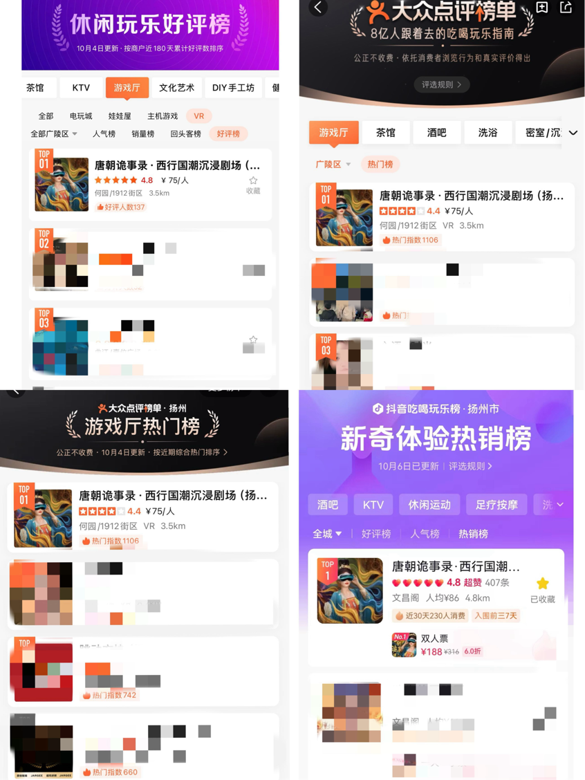 秋澄萬景麗,舉國同歡慶。這個國慶假期,揚州城控集團《唐朝詭事錄·西行》國潮沉浸式劇場迎來了開業后的首個旅游熱潮,大眾點評、美團多榜封頂,穩居Top1,好評如潮;抖音、小紅書、美團、點評等推廣平臺相關話題、短視頻等曝光量超500w,揚州文旅、揚州發布等官方媒體相繼對唐詭的熱潮進行了宣傳報道,成為國慶黃金周揚州文旅市場一大亮點。