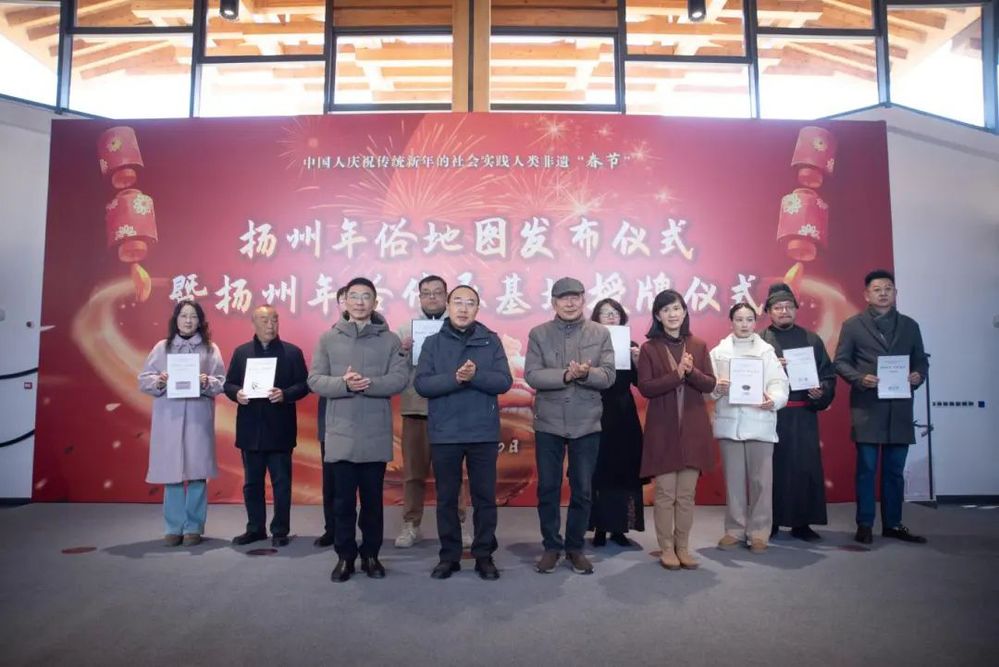 2025年1月10日上午,由揚州年俗保護單位揚州文藝家志愿者協會精心策劃的揚州年俗地圖發布儀式暨揚州年俗傳承基地授牌活動在小秦淮劇場熱烈開啟,為即將到來的新春佳節奏響了激昂序曲,也為揚州非物質文化遺產傳承與發展注入了新的活力。揚州市文聯黨組書記、文聯主席黃振宇、揚州城控集團黨委副書記徐飛、揚州市委宣傳部原常務副部長李廣春、著名文化學者顧風等嘉賓出席并授牌。