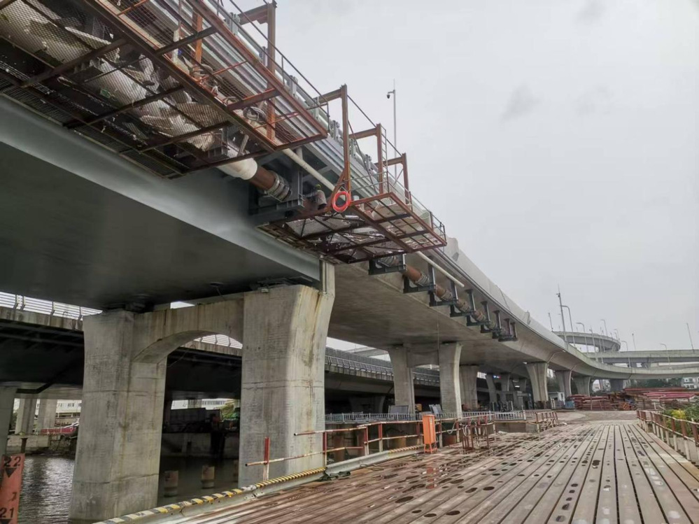 此次隨橋敷設的供熱管道是東南主干線(三期)一標段供熱管道建設的重要節點和難點,更是“互聯互通”的最后一環。隨橋敷設的管道采用DN600管徑,長約380米。項目建設初期,項目組積極與大橋建設、施工單位對接??紤]到橋體設計情況,經過雙方設計和技術人員充分溝通,決定采用鋼結構支架隨橋敷設,布置位置為利用預應力混凝土連續箱梁和鋼箱梁梁側生根。為保證橋面安全,施工過程中對每一道焊縫按規范要求進行了無損檢測,熱力管道的垂直荷載及軸向荷載均滿足該橋設計荷載要求。