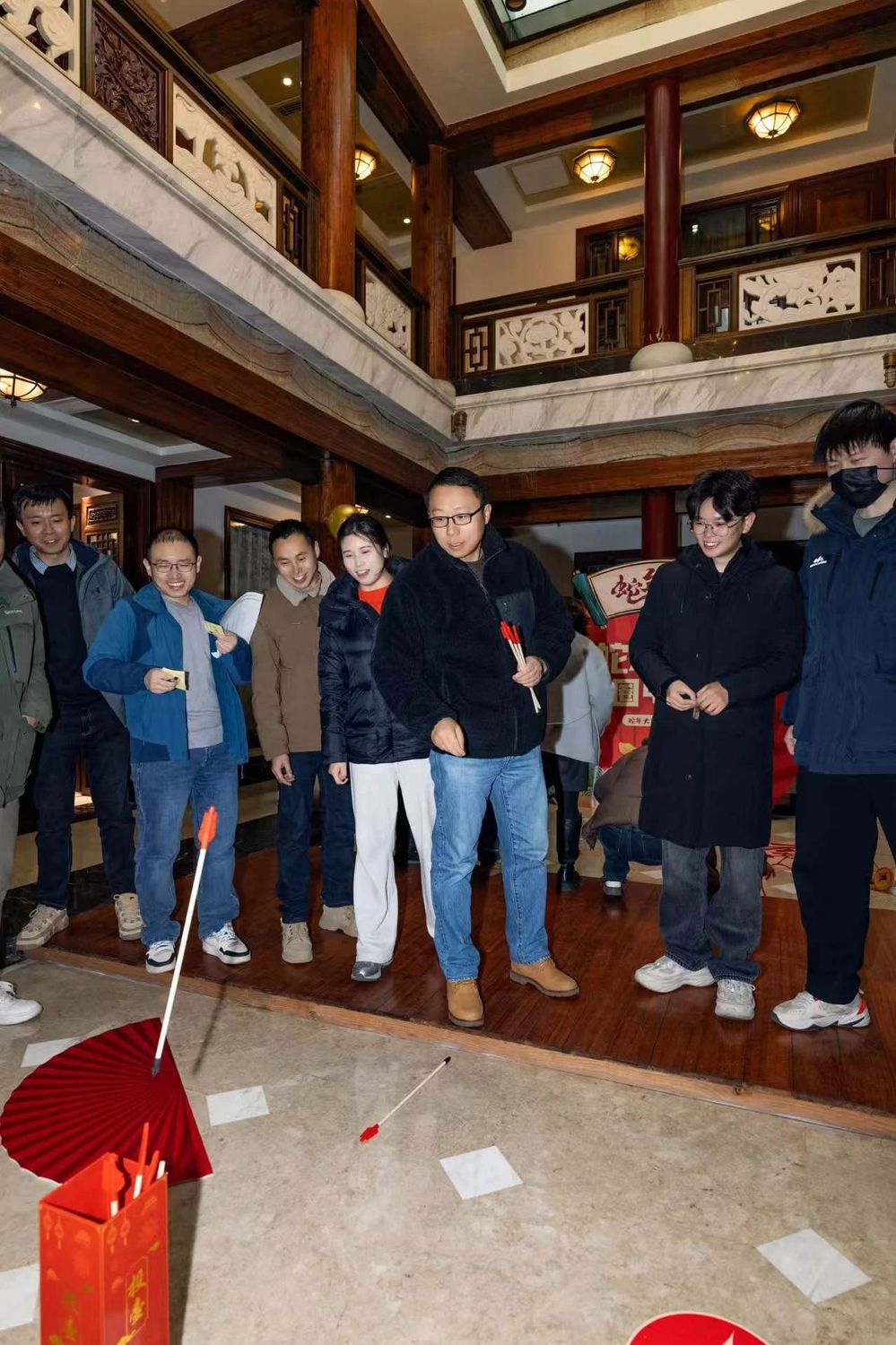 最先進行的是猜燈謎環節,大家圍攏在燈謎前,或低頭沉思,或相互交流,爭相猜解燈謎。緊接著,套圈和投壺環節更是將活動推向了高潮,笑聲、歡呼聲此起彼伏,活動現場洋溢著濃厚的節日氣氛。