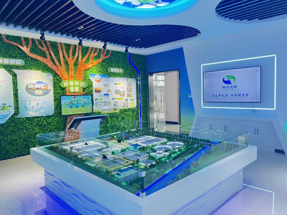 潔源環境公司一直積極致力于打造集生態知識科普、環保實踐體驗、綠色理念傳播于一體的綜合性環保教育平臺。內部共設有1個總館和3個分館,室內展廳內設有2套廠區布局沙盤、3套宣傳大屏、2套宣傳滾動屏、1套人機互動觸摸屏、1套交互式答題機等多媒體設施;室外設施主要涵蓋污水預處理、生物處理和提標段處理、中水回用等污水處理設施。