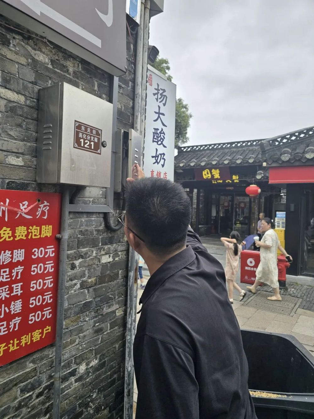 上午10點,地表溫度突破40℃。魯毅的工作服已濕透,他正蹲在一家文創店后巷,檢查私拉電線給電動車充電的問題?!靶±?,這線路像蜘蛛網一樣,臺風一來準出問題?!彼托慕忉?,并協助店主聯系專業電工重新布線。此時,對講機響起:“街區東門入口客流較大,需要密切關注!”魯毅立即調轉方向,通過智慧平臺調度保安分流人群,同時用擴音器提醒游客:“前面石板路滑,請靠右行走!”