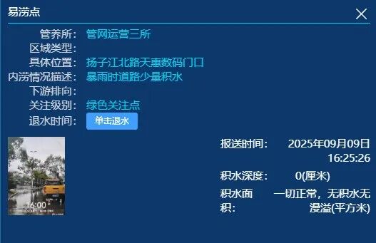 公司依托“城排通”智慧管理,對管網運行狀態進行實時監測。在關鍵節點安裝雨量傳感器、流量計、液位計等感知設備收集雨情、水情、管網液位等數據,及時上傳至管理平臺,一旦數據超出預警閾值,系統自動報警,快速定位,為防汛決策提供科學依據。通過平臺,可遠程調度應急設備與人員,實時查看重點點位現場情況,實現精準指揮,使防汛從“被動處置”轉向“主動預警”,大大提高了防汛工作效率。同時,公司注重歷次雨后復盤,使用“城排通”系統防汛板塊及時進行雨后總結,盯準薄弱環節,及時完善應對策略,為后續更好地開展防汛工作打牢基礎。