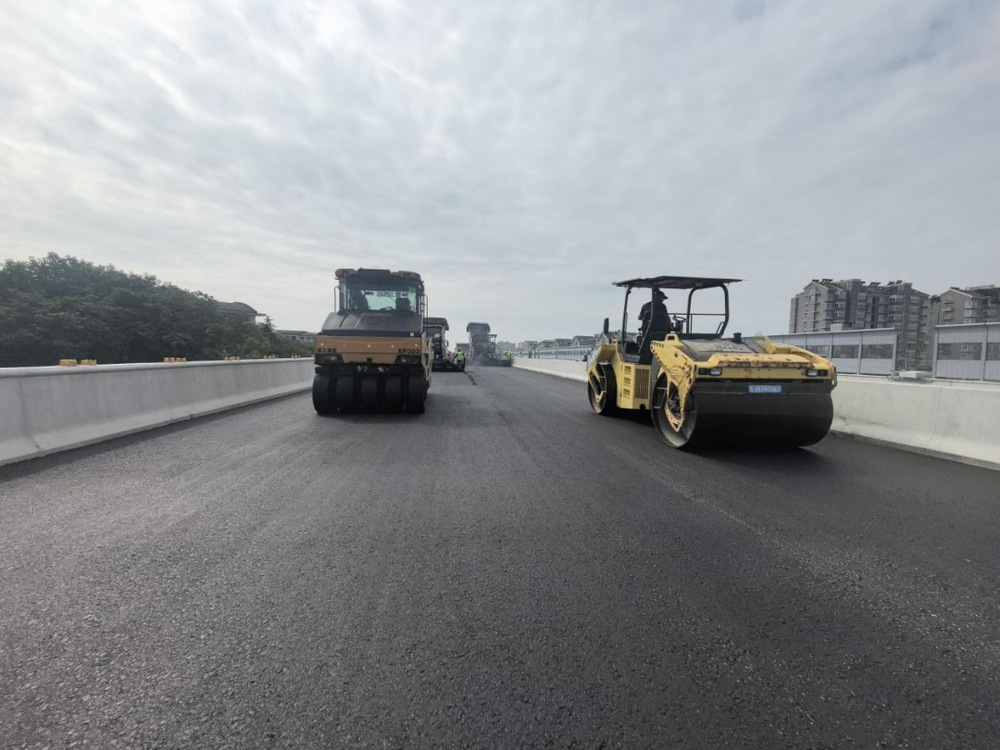 施工過程中,現場攤鋪機、壓路機等設備有序作業,管理人員對原材料質量、攤鋪溫度、厚度及平整度進行嚴格控制,確保各項施工符合各項規范要求,為后續橋面交通標志標線施劃、智能交通監控設施及亮化設備安裝打下基礎。