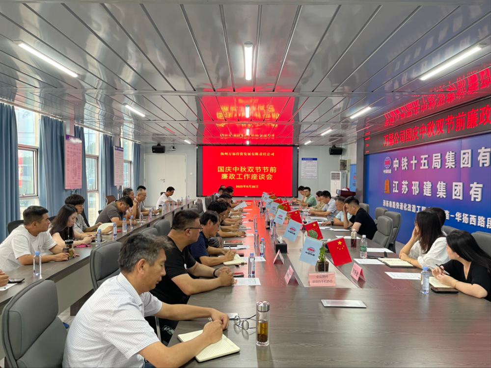 為深入貫徹中央八項規定精神,營造風清氣正的節日氛圍,嚴防“八小時外”和“節日病”,9月28日下午,萬福公司黨支部在潤揚路南延項目部開展節前廉政工作座談會。萬福公司領導班子成員、各部門負責人及現場工作人員;中鐵十五局、揚建集團、邗建集團、太平洋西北建設集團各項目書記、項目經理和監理單位工作人員參加會議。