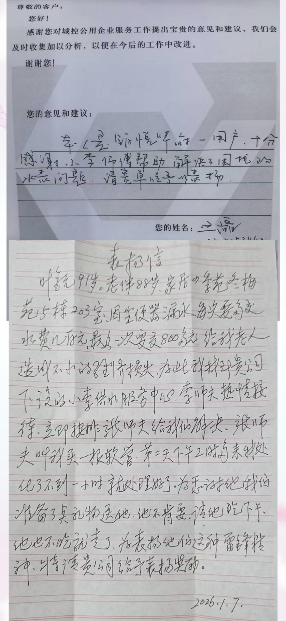 2025年12月10日下午及2026年1月7日,長江水務小李服務隊隊長李青同志及隊員,在文匯東路服務大廳先后收到兩位用戶的高度贊揚。用戶對服務隊專業高效、熱情周到的服務給予了誠摯肯定。