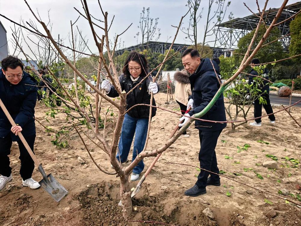 隨后,工作人員詳細講解了苗木種植要點、現場安全注意事項及分組安排,在領取鐵鍬、水桶、手套等工具后,大家迅速投入植樹作業,扶苗、填土、壓實、澆水,每一個環節大家都配合默契、一絲不茍,保證每一棵桃樹苗都能規范栽種、落地生根,36棵苗木很快在六圩污水處理廠的土地上整齊挺立,為廠區增添了一抹盎然春意。