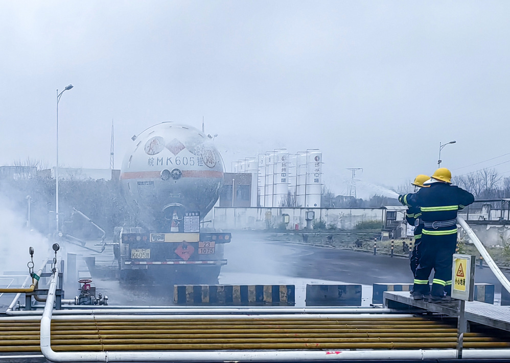 本次演練模擬液化氣槽罐車卸氣過程中突發泄漏應急處置:卸車操作工發現鶴管接口泄漏后,立即通知押運員關閉車載緊急切斷閥,卸車工關停壓縮機,充裝人員同步停止作業并關閉相關閥門。安保人員迅速設置警戒線,嚴禁無關人員進入;現場啟用霧狀水稀釋泄漏區域液化氣濃度,待濃度降至安全范圍后,維修人員更換損壞密封圈,并用可燃氣體檢漏儀復檢確認無隱患,隨后恢復充裝卸車作業。