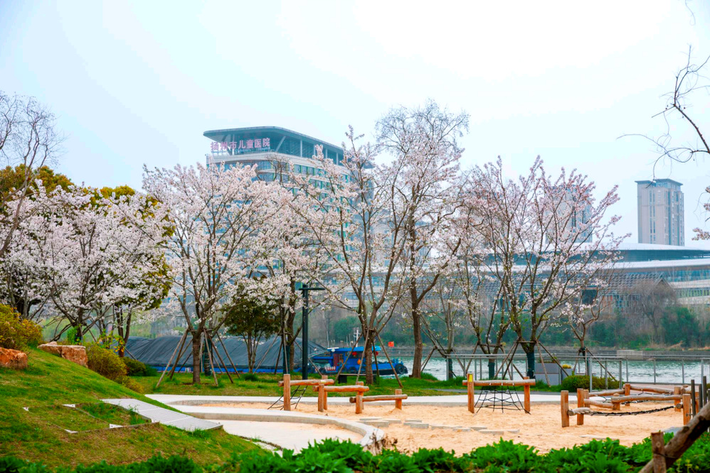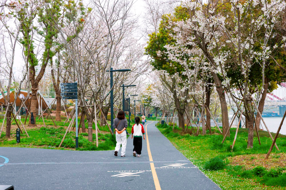 除了賞櫻,“運河十里”示范段還精心布局了多元活動場景,既有跑步道、漫步道、兒童沙池等休閑空間,滿足市民、游客春日踏青、親子游玩等需求,更融入了愛奇藝樂園、洞穴咖啡廳、“禁止跳水”日咖夜酒等新業態,讓春日時光既有自然賞味,也有現代意趣。