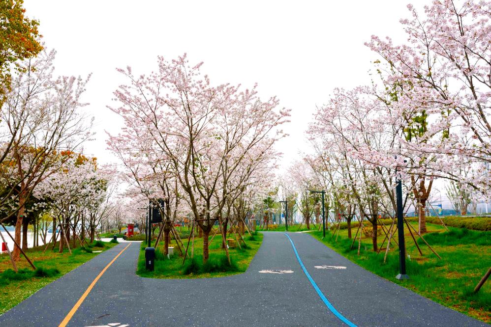 示范段內櫻種豐富、色彩繽紛。染井吉野櫻粉白相間,盛放時如云似霞;河津櫻艷粉點綴,萼筒泛著紫紅,靈動別致;高枝早櫻潔白素雅,花枝高懸,似雪覆梢頭。繁花綴岸、高低錯落,為運河繪就了一幅溫柔爛漫的春日畫卷。
